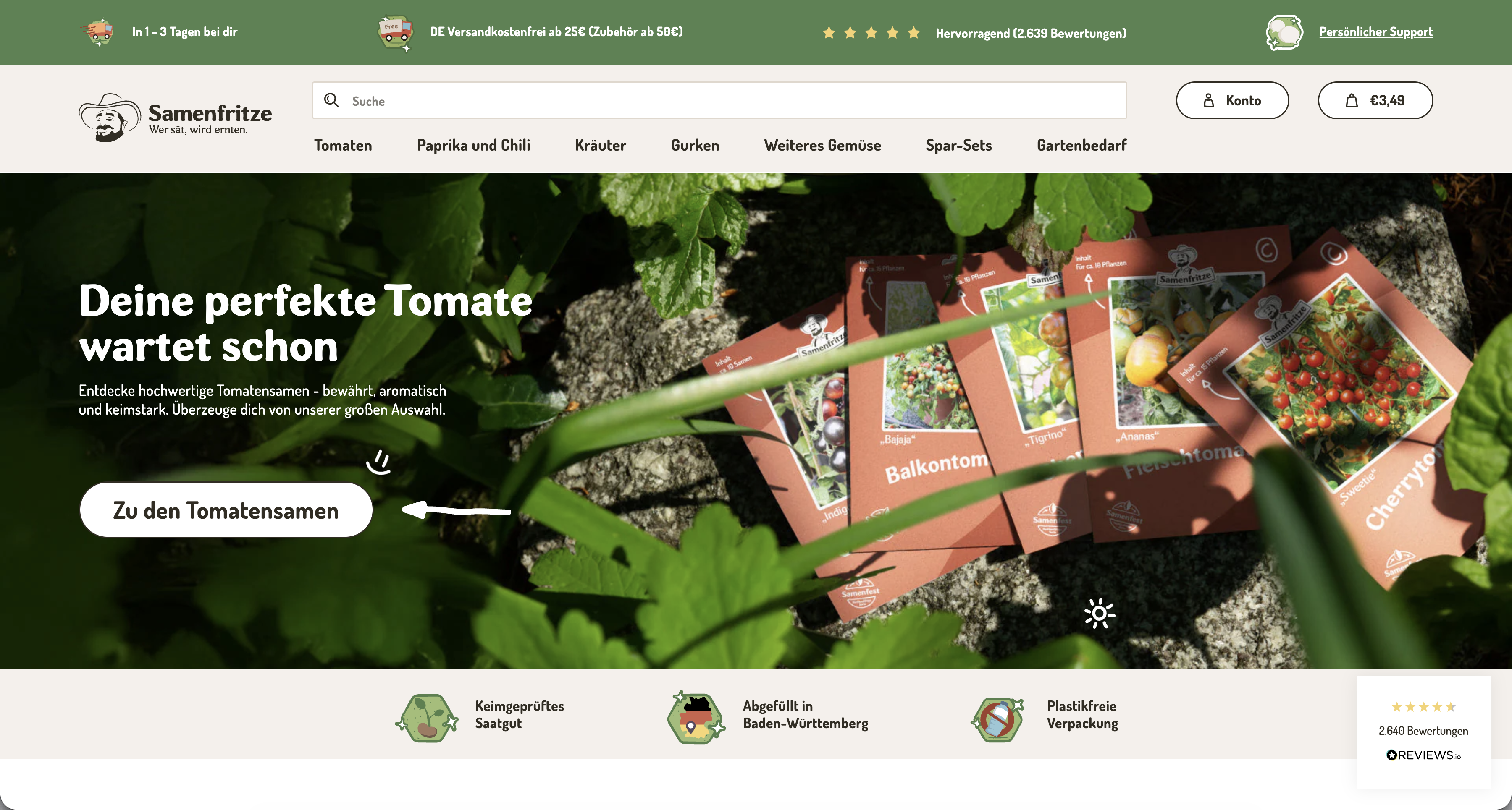 Samenfritze – ein leidenschaftlicher Anbieter für hochwertiges Saatgut und Gartenbedarf – benötigte einen modernen, performanten und benutzerfreundlichen Onlineshop. Dieser sollte das umfangreiche und vielfältige Sortiment für Hobbygärtner:innen und Profis digital erlebbar machen und gleichzeitig die Marke zeitgemäß und nahbar positionieren.
